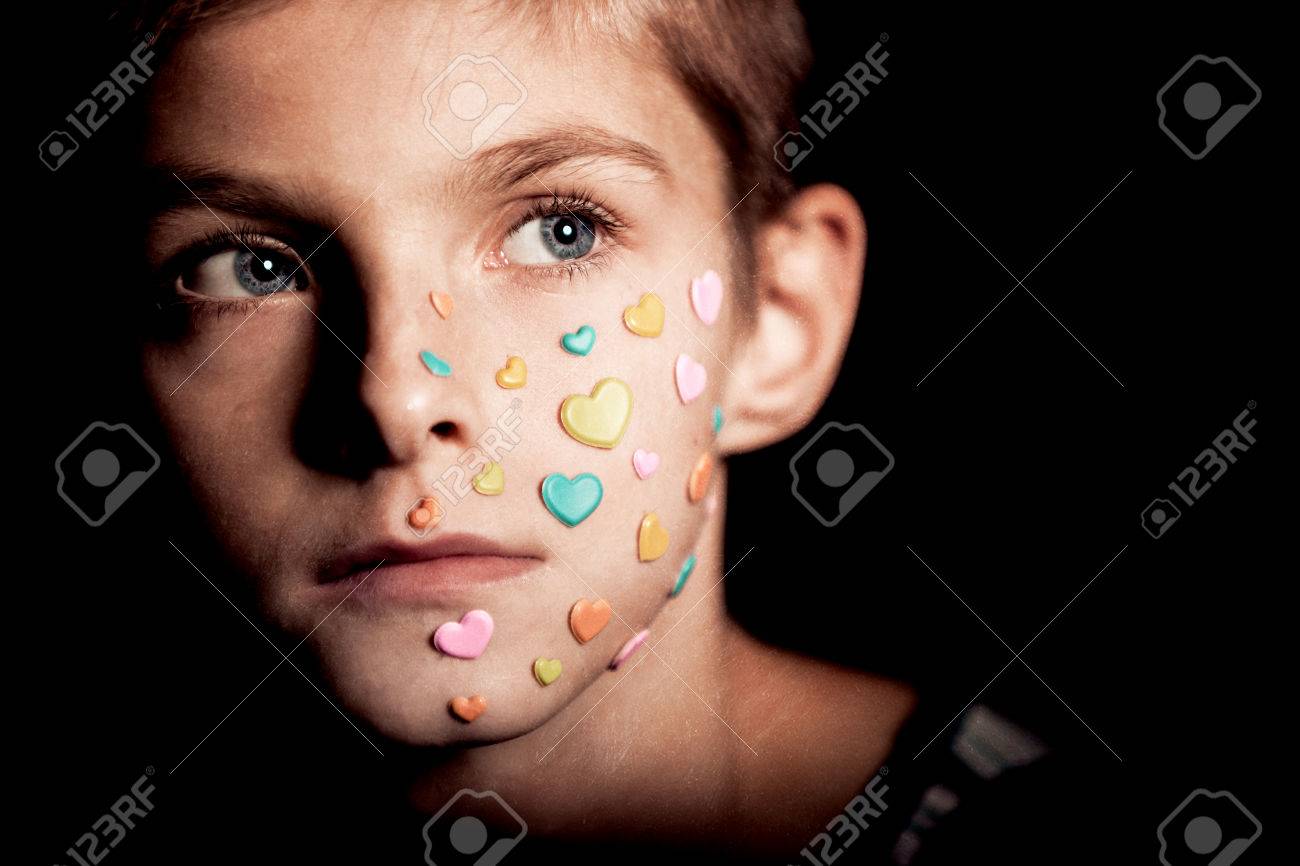 彼の顔は 見て 距離に対して黒背景に貼り付けられたカラフルな小さな心で思いやりのある少年の顔 の写真素材 画像素材 Image 51611692